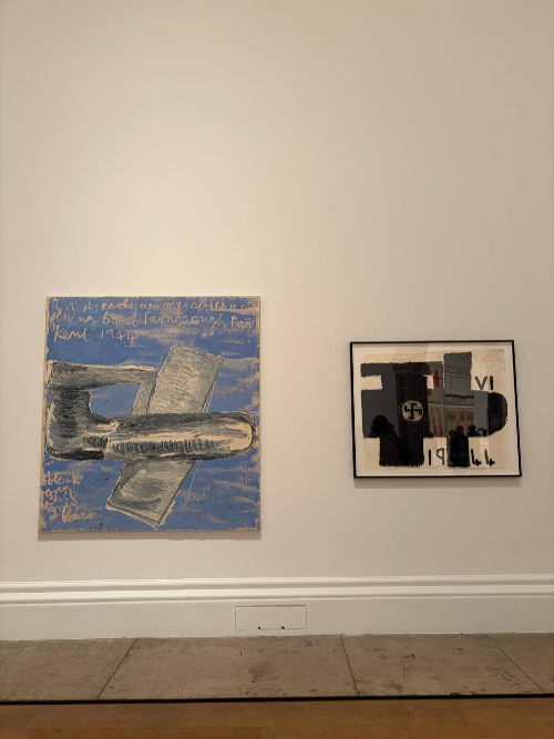She grew up in London during the Blitz. Remembers the bombing raids not with fear but with curiosity: her house took a direct hit. That became paintings — a recurring motif of the German V-1 flying bomb over London, personal history through the shape of a weapon.